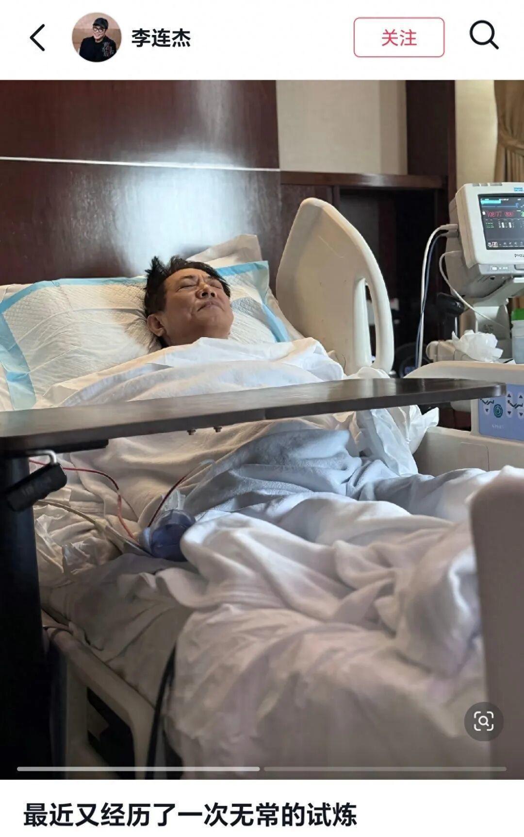 8月17日,李连杰在社交媒体上发布了自己躺在病床上的图片,并配文“最近又经历了一次无常的试炼”。