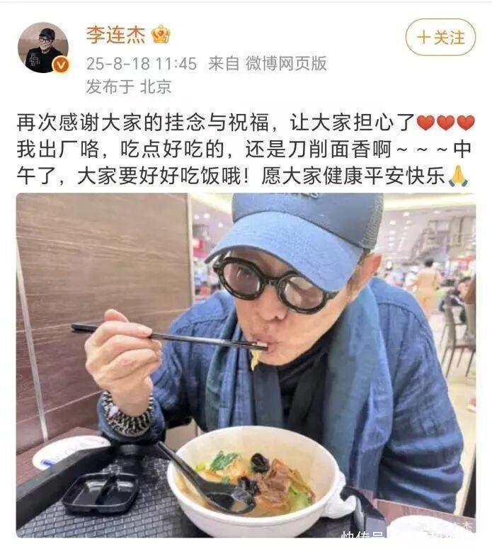 18日,李连杰在社交媒体上分享自己吃刀削面的照片报平安,他对大家的关心表示感谢,并宣布“出厂咯”。李连杰发布的视频内容显示,其目前已完成拆线。